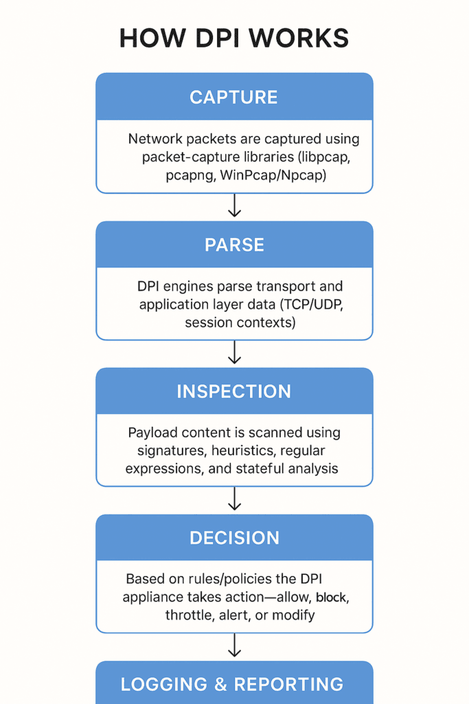 - Parsing: DPI engines parse transport and application layer data (TCP/UDP, session contexts).